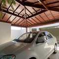 - Garagem coberta com acabamento em madeira e portão eletrônico