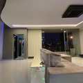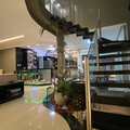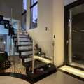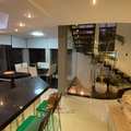 A sala de estar é um convite à socialização, com uma sacada que oferece vistas deslumbrantes da cidade e se integra harmoniosamente com uma cozinha moderna, totalmente equipada e planejada, além de uma elegante sala de jantar. O lavabo e o jardim de inverno ao pé da escada complementam o espaço com um projeto de iluminação pensado para criar uma atmosfera convidativa e quente.